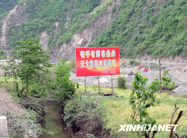 新华网成都5月11日电 广元市青川县是汶川地震的极重灾区。5月,记者又一次到这里采访,并深深为这座从废墟上拔地而起的崭新城市感到震撼。更让记者感动的是,在道路旁、山腰间、农居上,处处张贴着标语,为人们注解着创造奇迹的精神动力。“有手有脚有条命,天大的困难能战胜”、“出自己的力,流自己的汗,自己的事情自己干”、“一个支部一面旗帜,一个党员一个堡垒,一名干部一个标杆”、“掉皮掉肉不掉队,流血流汗不流泪” 折射出灾区重建"青川精神"。