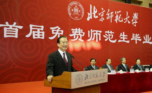 17日上午9点半,温总理与参加首届免费师范生毕业典礼的师生代表合影。接着,温总理观看了6所部属师范大学师范生免费教育成果展览。华中师大校长马敏向总理介绍了首届免费师范生教育成果。马敏说:“华中师范大学现有免费师范生8991名,占全校本科生的一半。2007级2200名免费师范生全部签约,一半以上志愿选择到边远地区和县及县级以下的中小学从教”。总理听了点头说好。