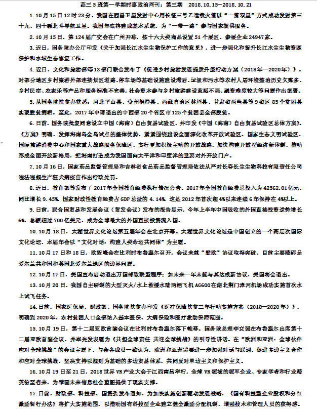 高三5班第一学期时事政治周刊:第三期 10.15-10.21