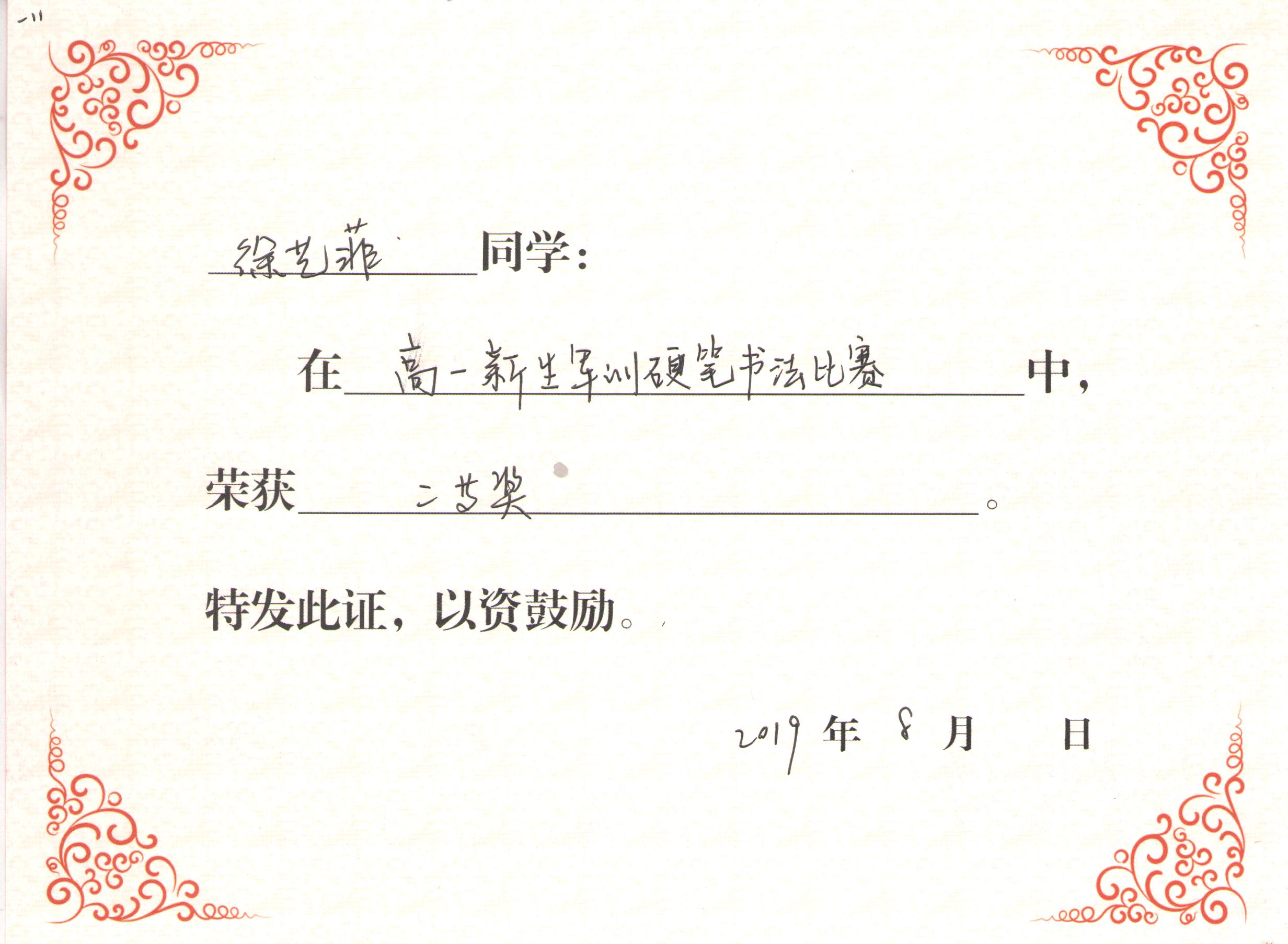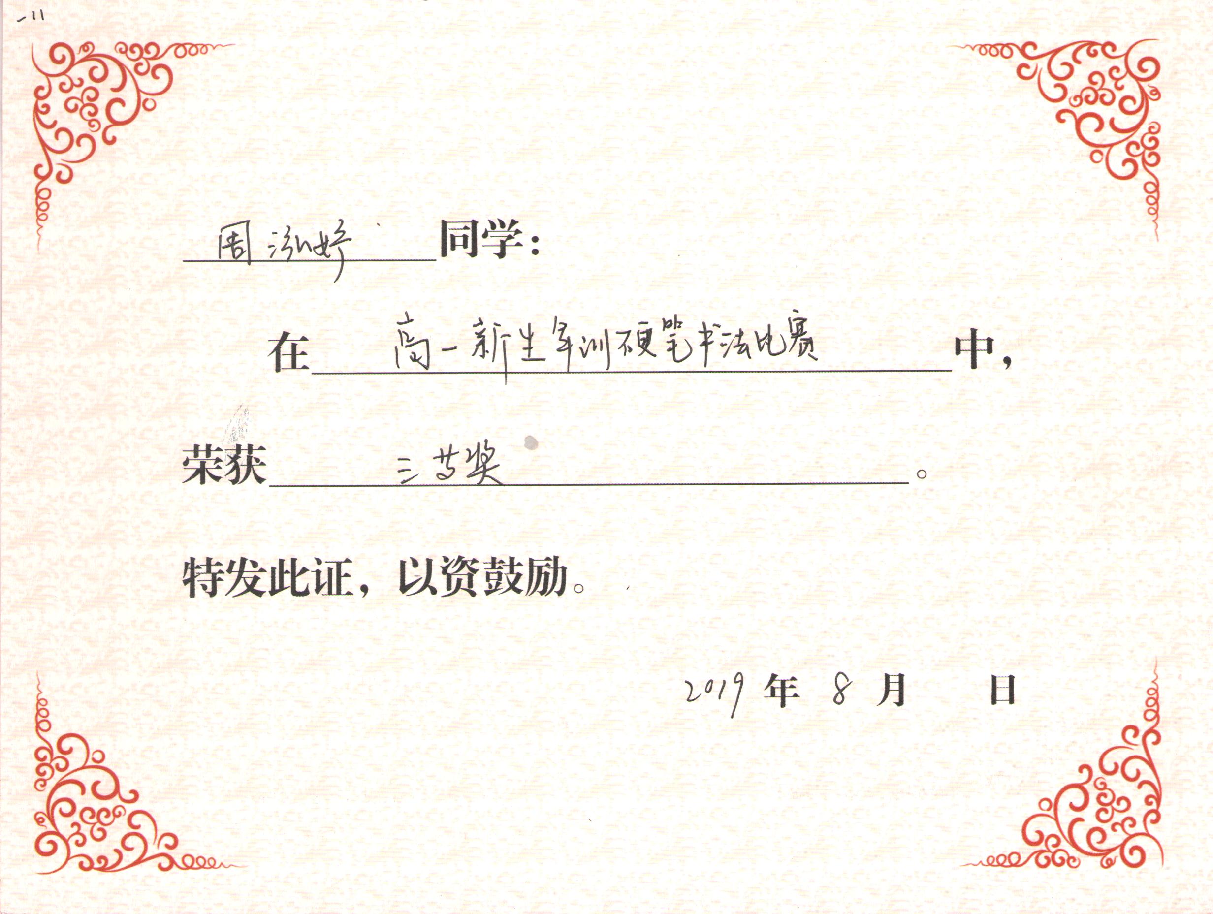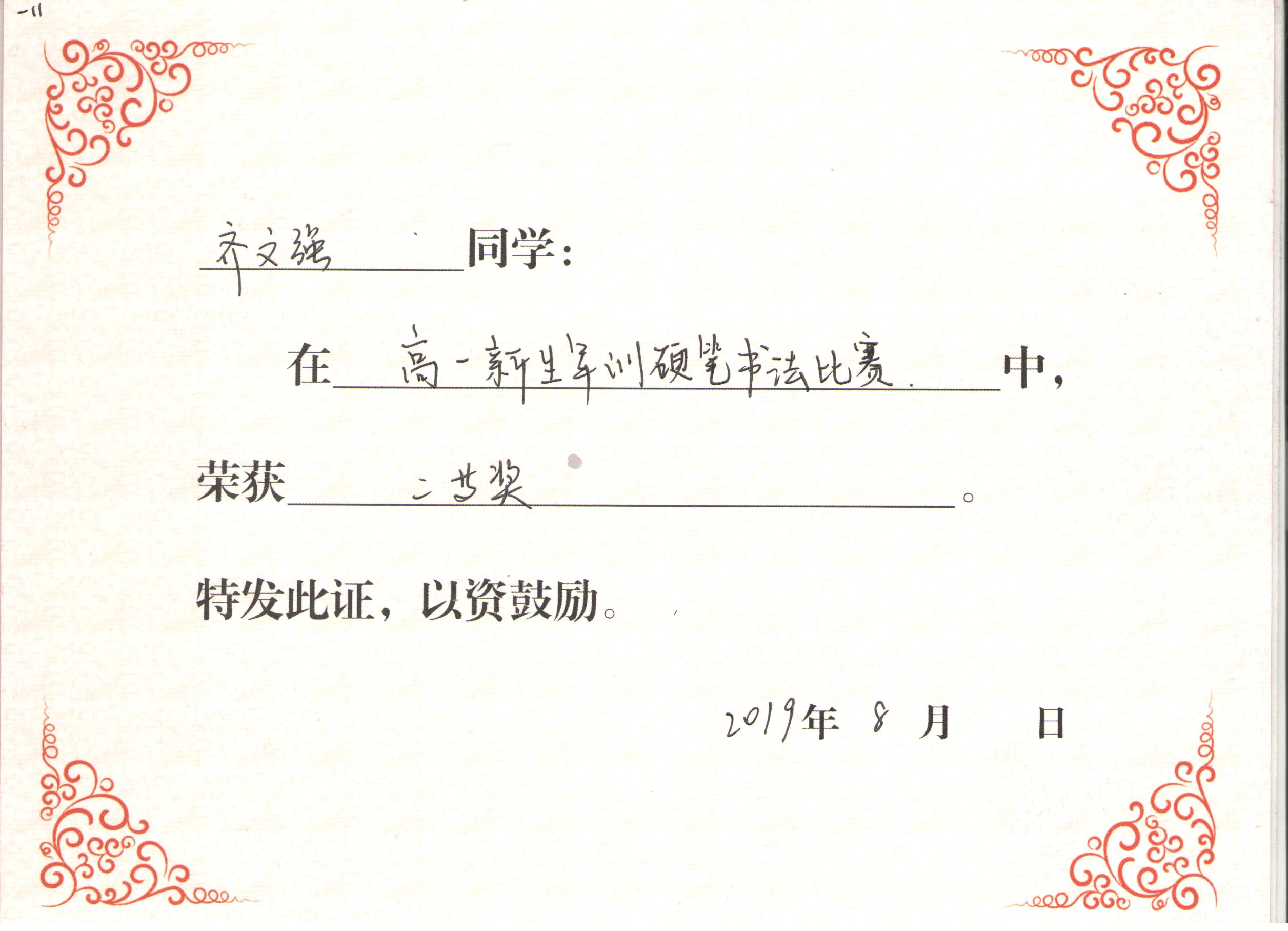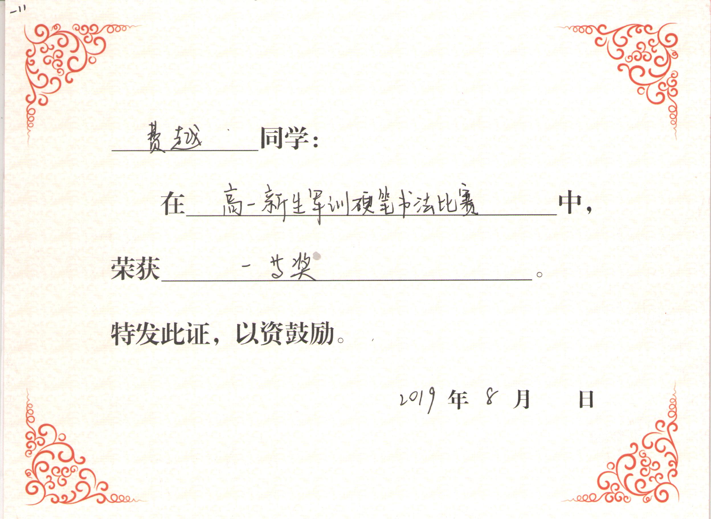 高一11班新生军训硬笔书法比赛获奖证书 201908