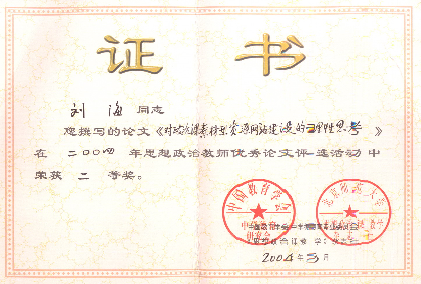 2004年8月,论文在中国教育学会中学德育专业委员会和《思想政治课教学》杂志社联合举办的2004年度优秀论文评选中获得二等奖。