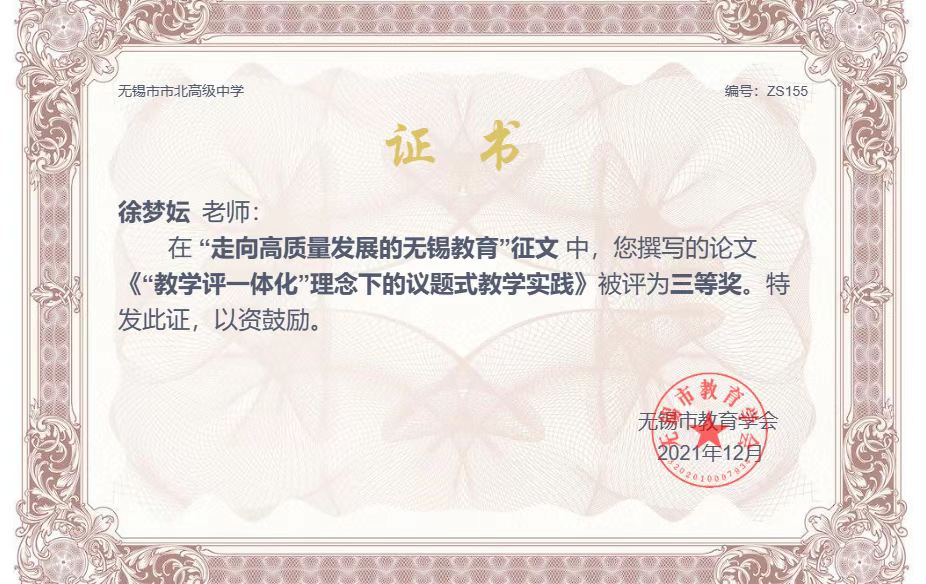 徐梦妘老师论文在无锡市教育学会论文评比中获奖202112