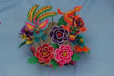 王筱莹告诉记者,她今天做的是“虎馄饨”,因为使用了染料,做出的面花色彩艳丽夺目,但不可食用,只能观赏。这种染料是最近几年才开始用的,以前的面花是用不同颜色的蔬菜水果汁调色,做成的面花都可以吃,就是色彩平淡一点,调汁的分寸也不好掌握。说话间只见她揉捏自如地把玩着手中的面团儿,不一会功夫身旁已放满了造型各异的面花雏形。剪、镊、压、点,和几乎所有的中国传统民间艺术一样,工具的简单和作品的变化万象散发出“面花”的神奇气息。整整一个上午,一直忙个不停,中午时分,一对栩栩如生的龙凤就成了型。