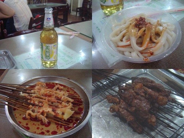 我们两组人在西安回民一条街享受着正宗的羊肉泡膜、烤羊肉、烤牛肉,再加上西安的果啤,真是难得的一种享受。具体的烤羊肉串价格也是不一样,我们两组人吃的有一串的有0.4元、0.5元、2元、5元、10元的。孙震、俞琪这一组吃的是0.4元每串的,居然吃了100多串,真是大饱口福。我和邵凯这组是吃了羊肉泡膜,外加烤羊肉串(2元每串)。这些正宗可口的美味是在洛川这样的小县城所无法享受到的。到晚上十点多大家才最终回到酒店休息。