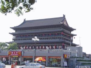 鼓楼位于西安城内西大街北院门的南端,东与钟楼相望,始建于明太祖朱元璋洪武十三年,比钟楼钟楼大四岁,迄今已有625年历史。清康熙三十八年和清乾隆 乾隆五年先后两次重修。楼上原有巨鼓一面,每日击鼓报时,故称“鼓楼”。历经岁月沧桑,如今巨鼓早已不存,惟余鼓楼巍然耸立。